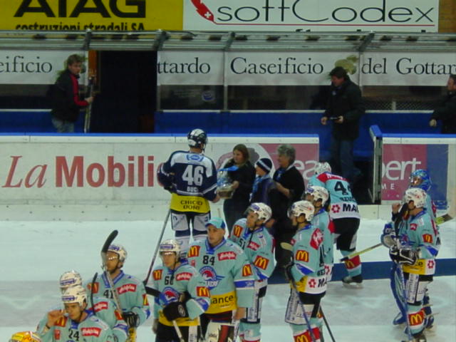 Il terzo finale si apre con la prima rete con l’Ambri del nuovo arrivato, tale Zdenek Blatny, ottimaente servito da Duca, finta sul portiere e gol ! 2-2, I nostri sembrano trasformati, ritrovano vigore e forza. Dopo poco più di 2 minuti, ecco la rete del vantaggio, azione insistita di Demuth, passaggio sottoporta a Duca, che insacca da un passo, 3-2. Forse siamo riusciti a girarla ….. Ritmo ed intensità sono aumentati così come i contrasti, buone occasione sui due fronti si susseguono, ma a circa 5 minuti dal termine, Gautschi si lascia scappare Steiner, il quale centra per Czerkawski, che insacca, 3-3. Finale di tensione, col Rappi proteso alla ricerca della rete della vittoria, che come scritto in apertura, cade a soli 16 secondi da termine.