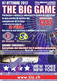 the big gamePer domenica 7 ottobre 2012 dalle ore 15:00 in occasione della partita di campionato tra HC Biasca e EHC Schaffausen, VOGLIAMO REALIZZARE IL GRANDE RECORD DI PRESENZE E SUPERARE I 1234 SPETTATORI stabilito nella finale di campionato di seconda lega della scorsa stagione per il girone della svizzera orientale. Dai aiutaci in questa nostra impresa!